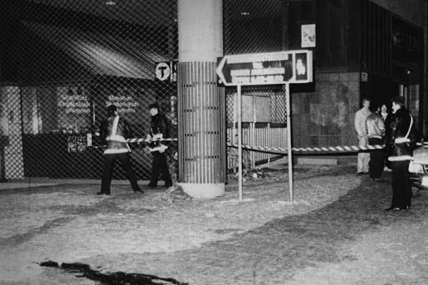 Red-and-white plastic tape with the text POLICE was stretched across Sveavägen from the corner of the paint store Decorima, around a tree on the sidewalk, and around a pillar at the entrance to the subway.